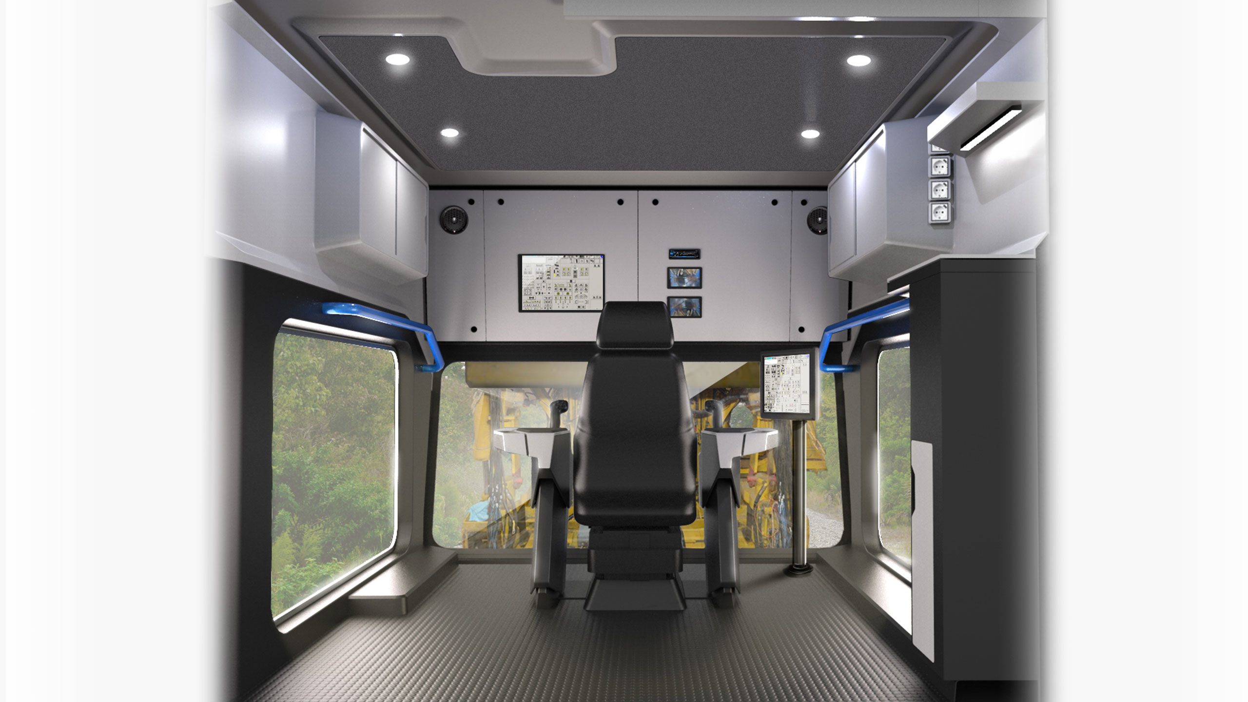 Gleisstopfmaschinen dienen der Instandhaltung des Gleisbettes von Bahnschienen durch mechanische Verdichtung des Schotters. Für den Bediener in der Kabine bedeutet das acht Stunden volle Konzentration auf die hochkomplexen Aufgaben der Stopfmaschinen-Bedienung. Das Ganze auf 9 m² – auch nachts, bei Hitze wie bei Kälte. Im Rahmen der Modernisierung der Unimat-4S-Maschine sollten die Arbeitsbedingungen in der Kontrollkabine verbessert und mit den neuen Steuerungselementen wie Joystick und Touchscreen ergonomisch und modern gestaltet werden.