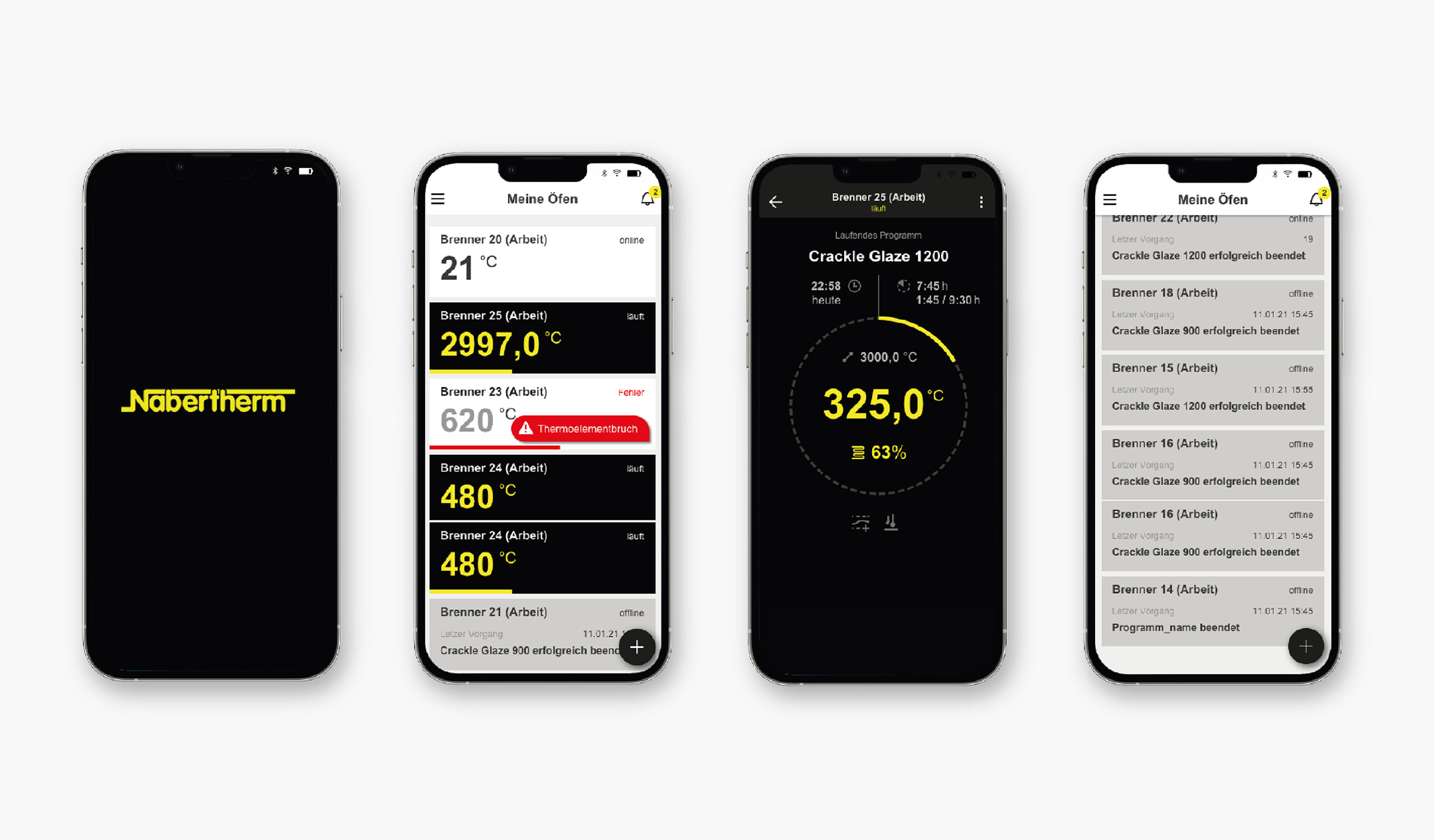 Nabertherm hat eine mobile App für seine Industrieöfen entwickelt. Unsere Aufgabe war es, die Basis einer UI Design Language für Embedded Systeme auf mobile Endgeräte zu übertragen und zu erweitern. Dabei besitzt die App keine Steuerungsfunktionen, sondern dient nur dem Monitoring der Öfen. Unser Anspruch war es, die Customer- und User Experience in der konsistenten Bedienung auf den mobilen Endgeräten zu gestalten.