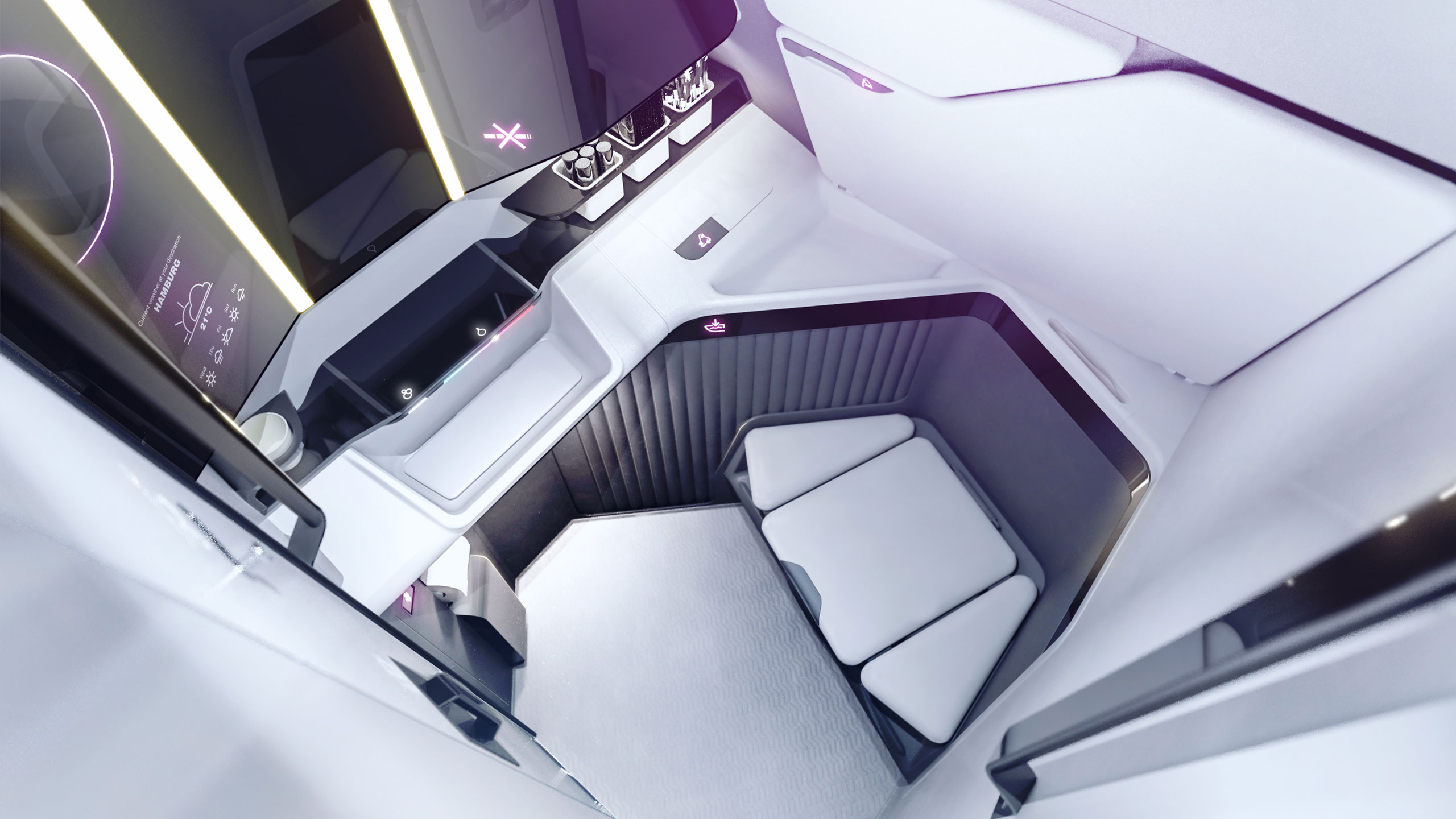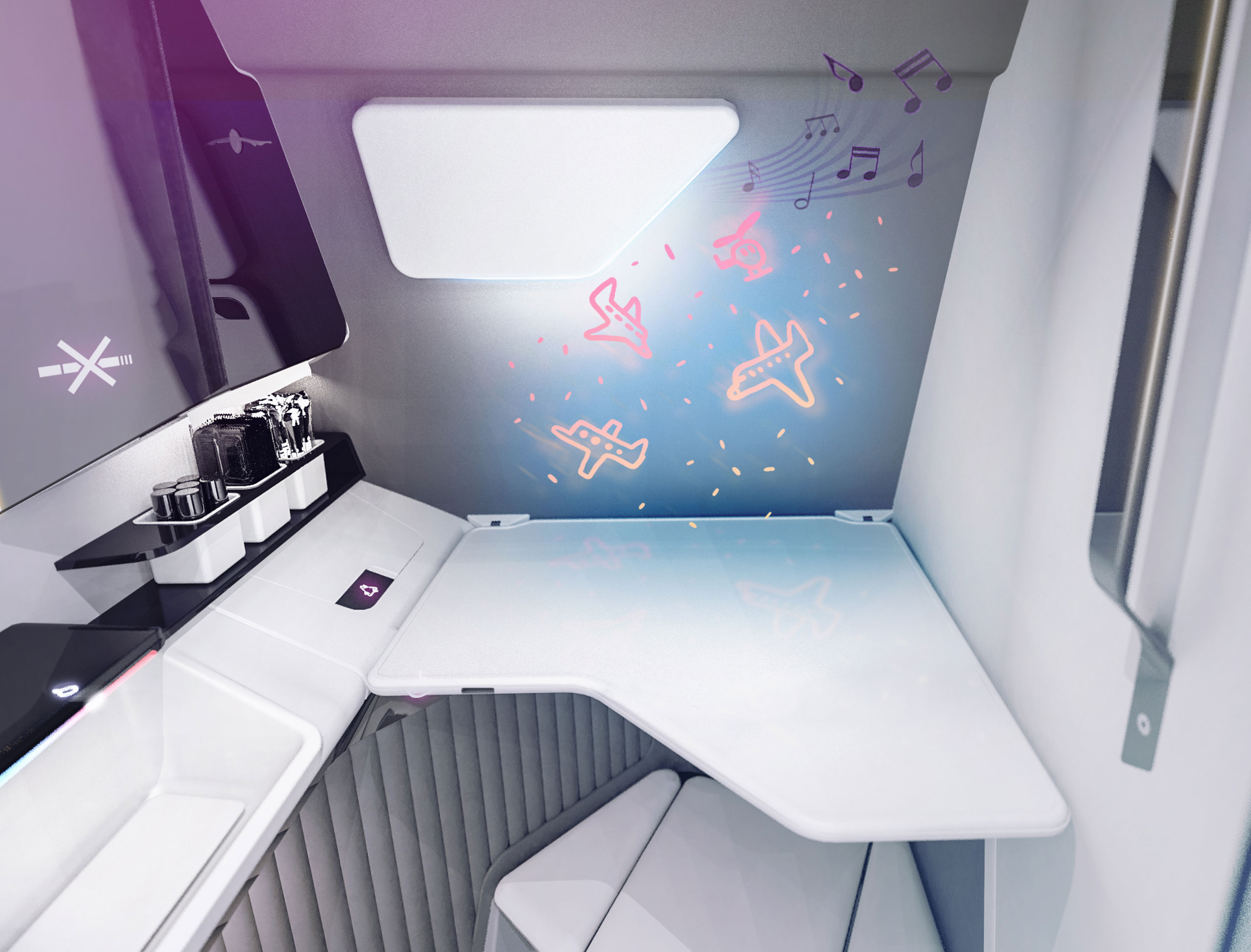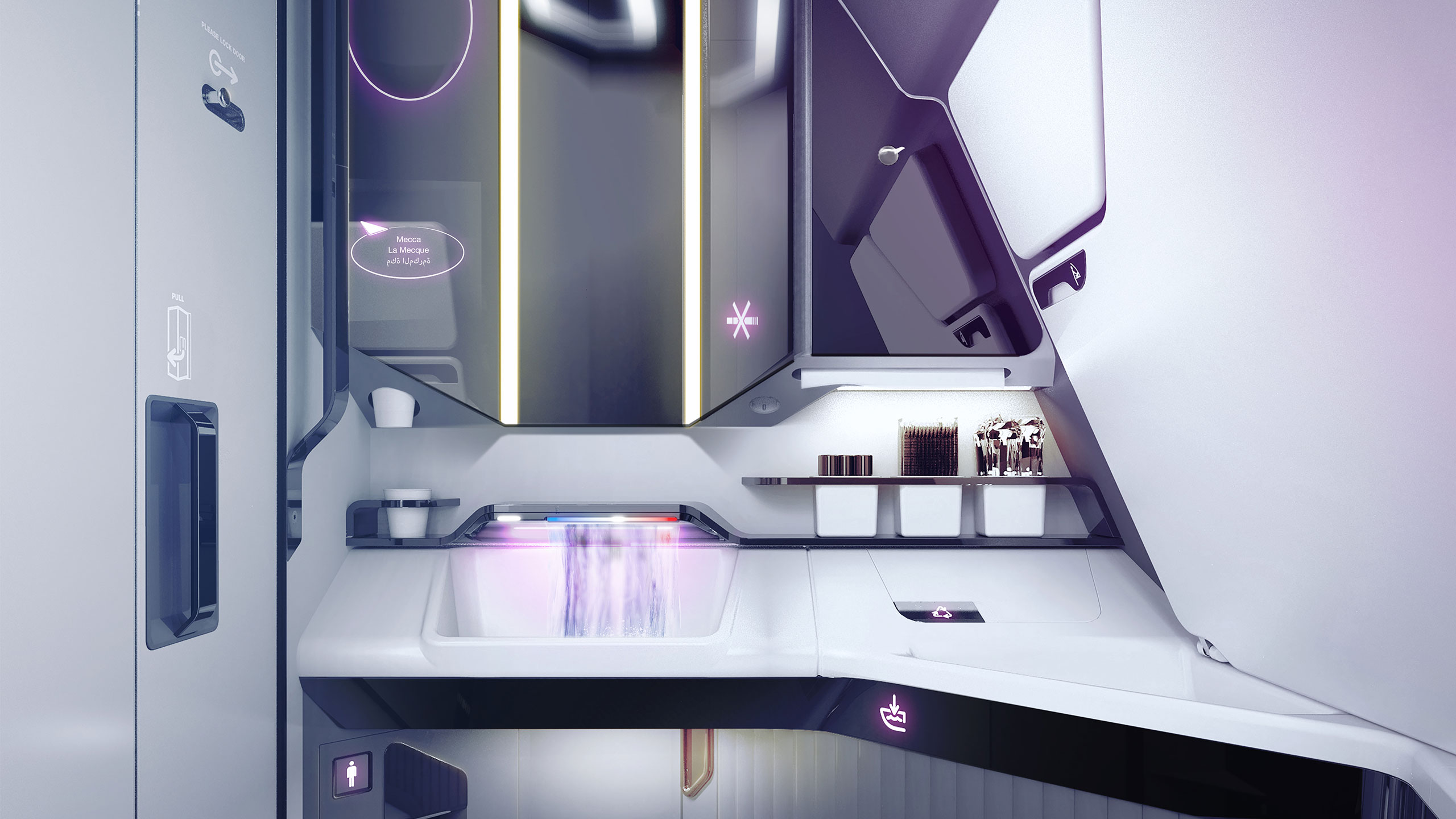 Fliegen in bequemen Jogginghosen und kurz vor der Landung zurück ins knitterfreie Businessoutfit – mit den verschiedenen Hänge- und Ablagemöglichkeiten, auch auf dem gepolsterten Toilettensitz, gelingt der Businesslook schnell und einfach. Der durchgehende Ganzkörperspiegel ermöglicht dem Reisenden eine Sicht von fast 360°.